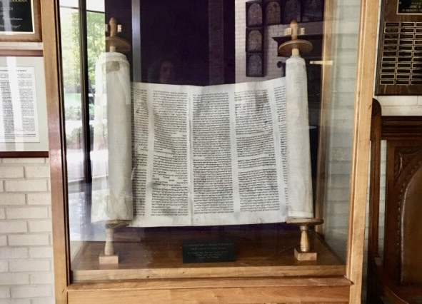 The Holocaust Torah was brought to Beth Israel Congregation in Jackson Mississippi. It has stood in its glass case in the synagogue since 1992, in silent memory of those people and religious items which survived the Shoah in Europe.